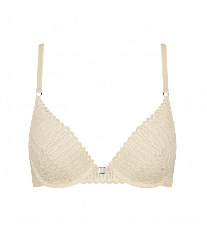 Elegancki biustonosz Aura Spotlight WHU marki Triumph w jasnym kolorze to stanik typu push-up z pogrubionymi miseczkami. W przypadku głębokich dekoltów, model ten okazuje się niezastąpiony - perfekcyjnie unosi, eksponuje i zbiera biust, tworząc piękny dekolt. W odróżnieniu od kwiecistych deseni, biustonosz ten wykonany jest z eleganckiej koronki o nowoczesnym wzorze, typowym dla biustonoszy z kolekcji Aura Spotlight, która podkreśla modny i niebanalny styl bielizny.